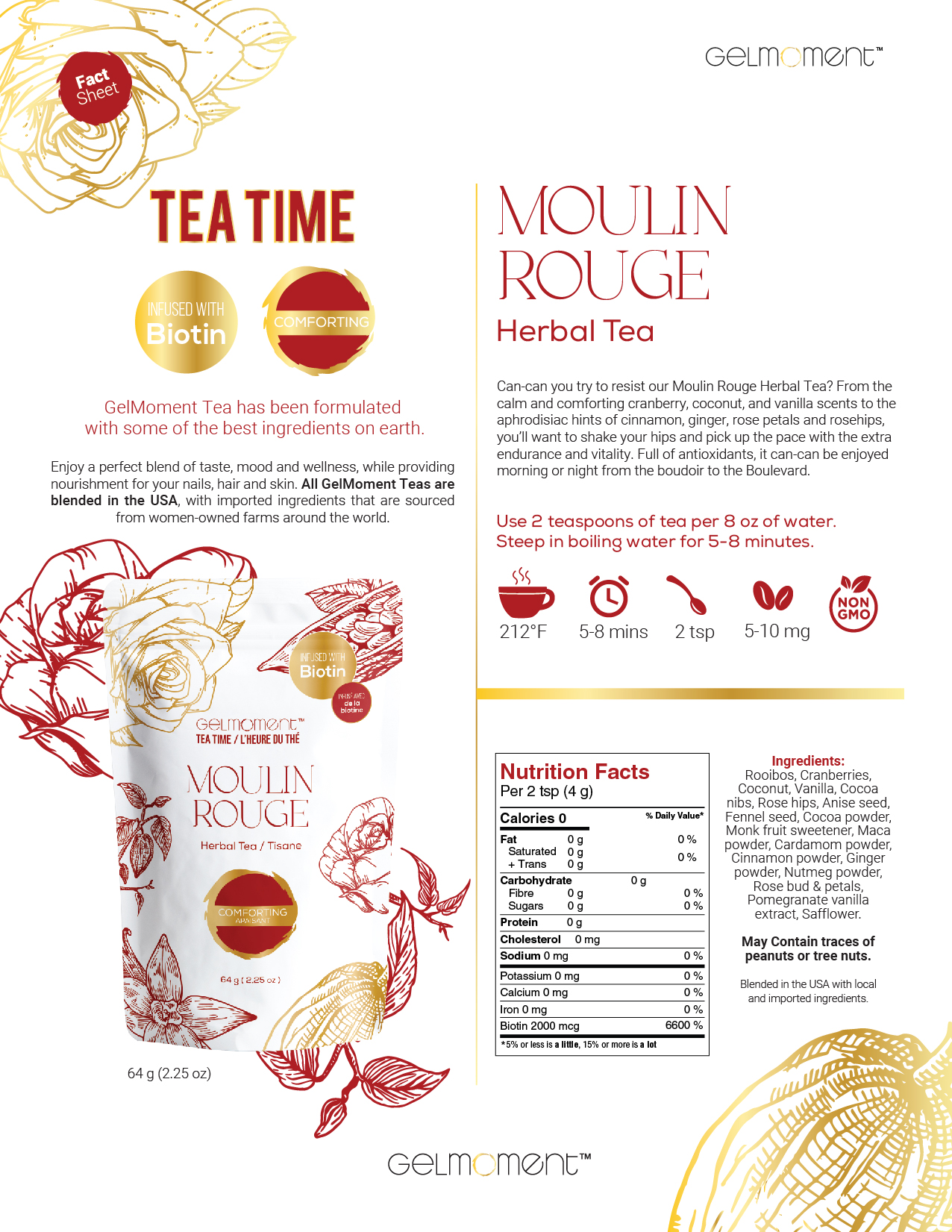 Can you try to resist our moulin rouge herbal tea? From the calm and comforting cranberry, coconut, and vanilla scents to the aphrodisiac hints of cinnamon, ginger, rose petals and rosehips, you’ll want to shake your hips and pick up the pace with the extra endurance and vitality. Full of antioxidants, it can be enjoyed in the morning or night from the boudoir to the boulevard.